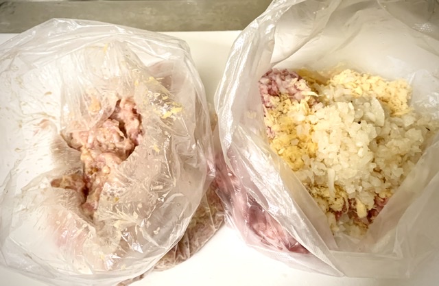 玉ねぎはみじん切りがされていたので軽く炒めて袋に入れ、調味液(卵と片栗粉)も入れたらしっかり混ぜ混ぜ…。袋の底を斜めにカットして絞り出すようにレシピに記載されていました。