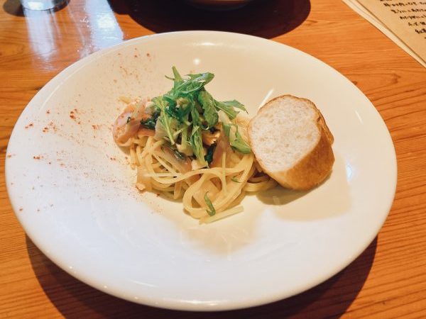 この日のパスタは「秋鮭れんこんと大根、赤玉ねぎのオイルパスタ」。パスタがもっちもちでとても美味しかったです。旬の食材をふんだんに使用した奥深い味わいはアージオならでは!