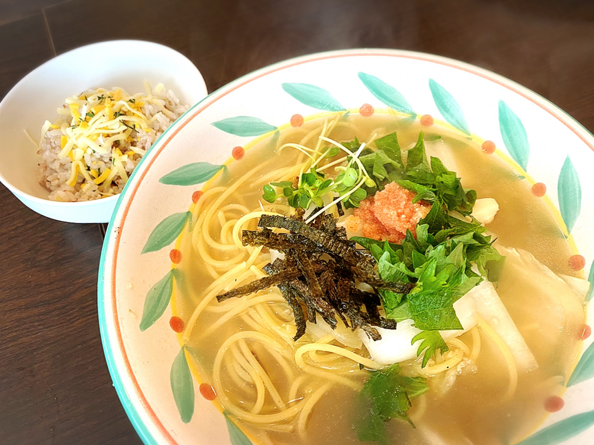 食べ終わるまで暖かいままのスープ!お皿に秘密があるのかな?締に、チーズライスをONしてリゾットに♡