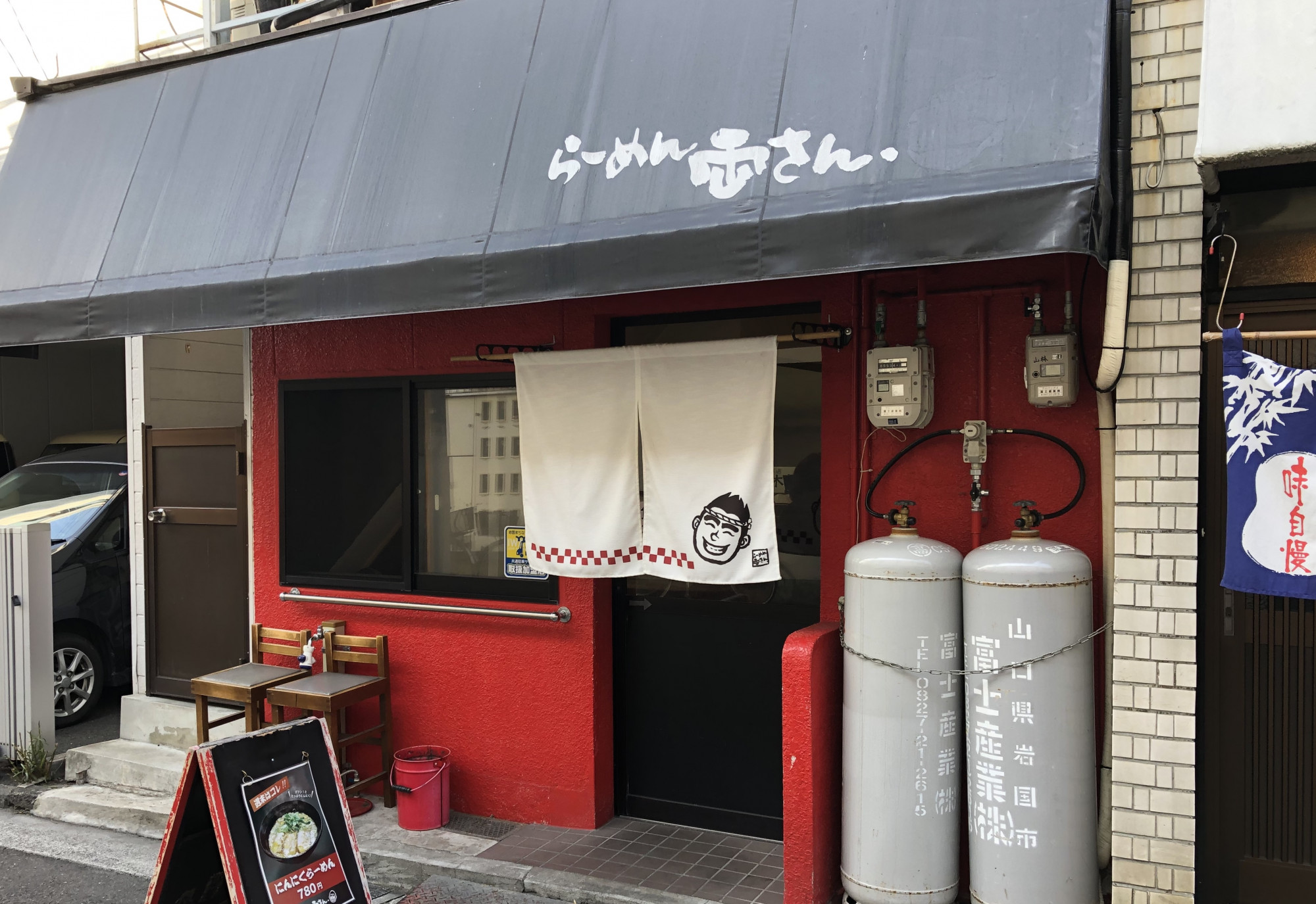 さて、今日ご紹介するのは・・・岩国の中心街にあるのですが、メイン通りから一歩奥ばった通りにある 知る人ぞ知るお店です。この暖簾が目印のラーメン店『らーめん 両さん』です。
