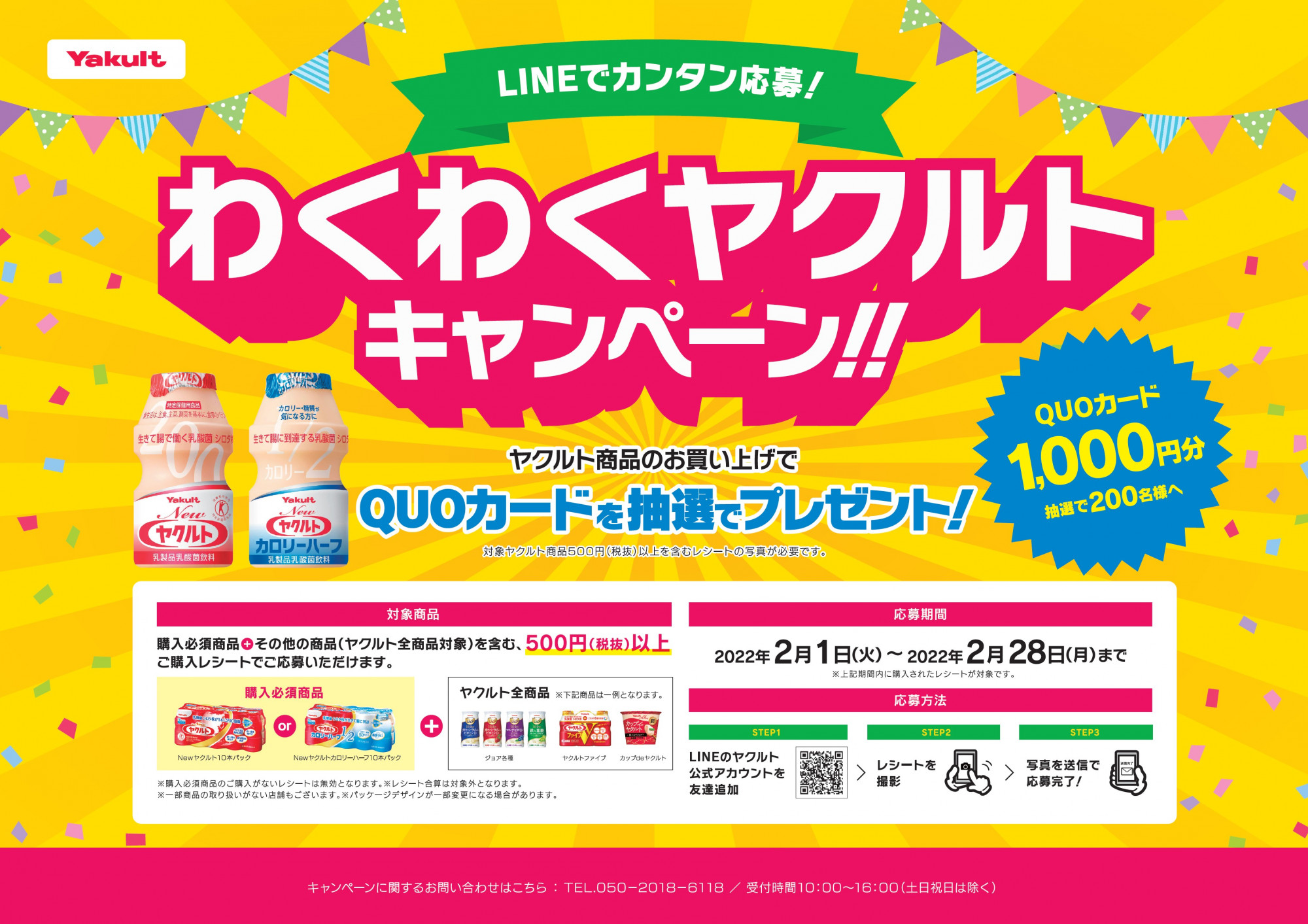 対象商品のNewヤクルト10本パックもしくはNewヤクルトカロリーハーフ10本パックを含むヤクルト商品税抜500円以上のレシート画像を、ヤクルト本社西日本支店LINE公式アカウントに送信すると、抽選で200名の方にQUOカード1,000円分が当たります。