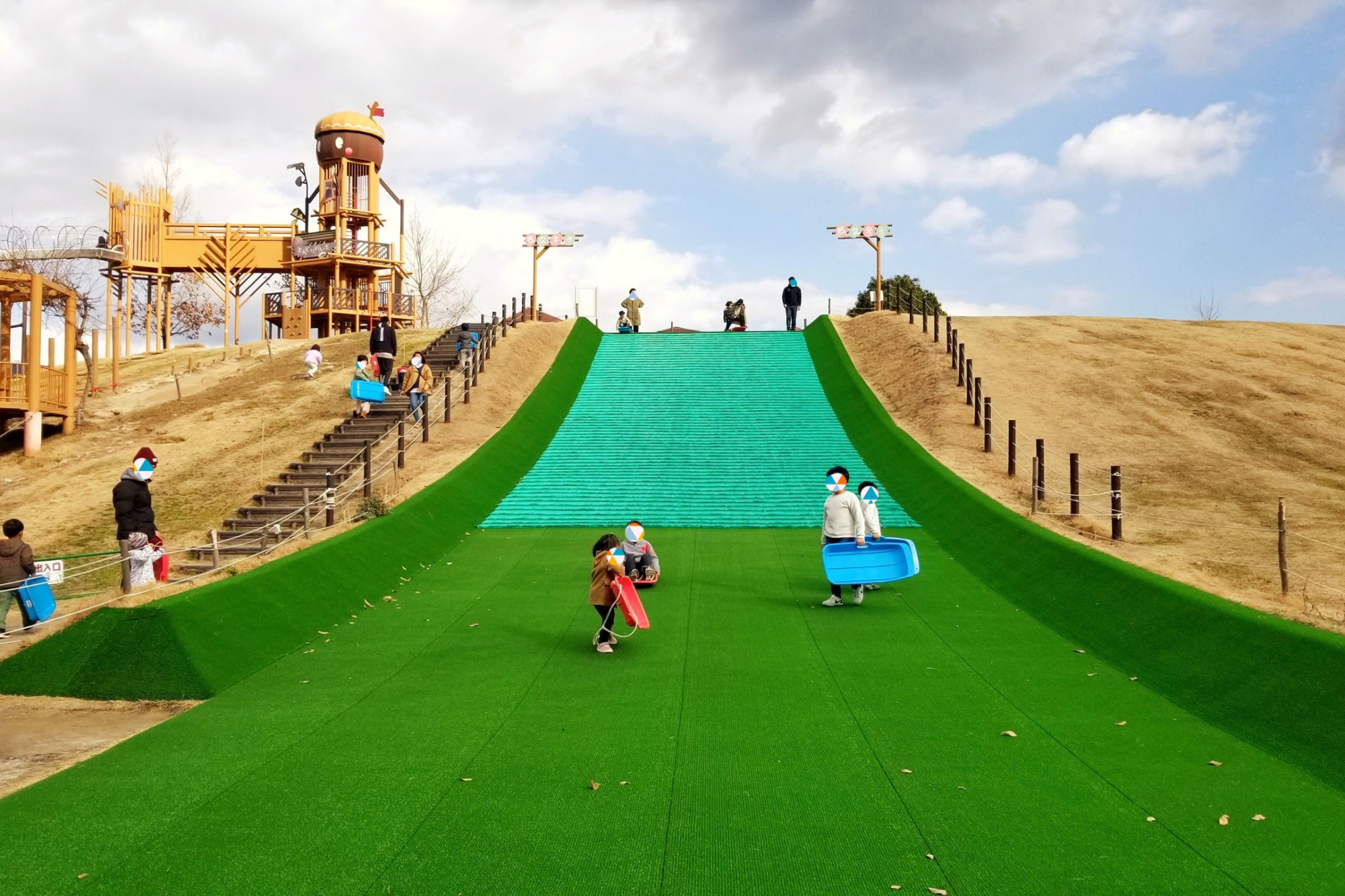 ロングスライダーと人気を二分する人工芝ソリゲレンデ。管理棟で受付を済ませ、貸し出し用のソリを持ったら、いざゲレンデへ!!管理棟では、時間を区切り、人数にも制限があり、子どもたちで賑わっている割りに混乱なく遊べます。