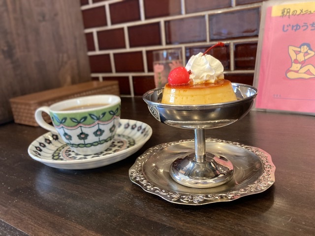 私のお目当ては、『台湾カステラアラモード 650円』だったのですが、残念ながら売り切れ・・(次は絶対食べる)今回は昔ながらのプリンと珈琲のセット650円を頼んでみました。
