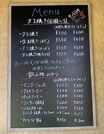 メニューは基本のタコ焼きの他に「ねぎ・チーズ・明太マヨ」の3種類があります。