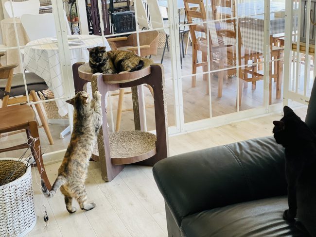 店内入ってすぐのランチ&カフェスペースは12席用意されています。猫ふれあいルームと併設されているので猫ちゃん見ながらゆっくりランチも(‘▽’) 幸せな時間ですねー。