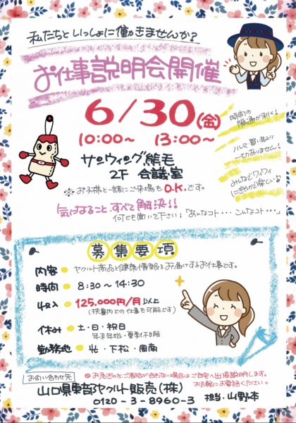 現在、山口県東部ヤクルト販売では一緒に働いてくれる仲間を募集しています!(2023年6月時点)