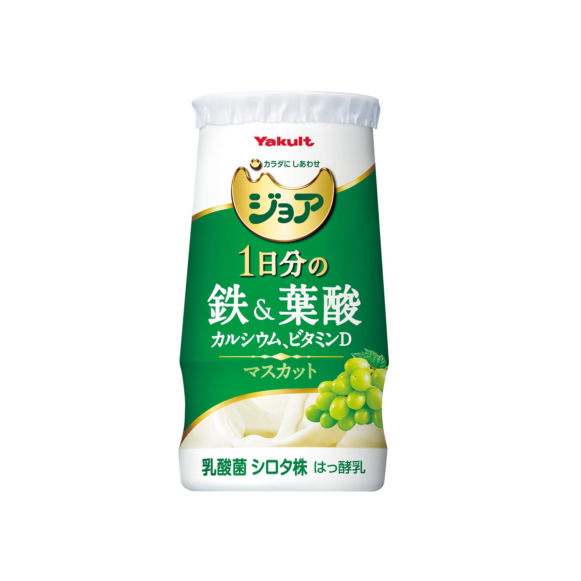 「乳酸菌 シロタ株」と「牛乳1杯分のカルシウム」の機能プラス 1日分の鉄(6.8mg)と葉酸(240μg)が補給できる高付加価値ジョアです。マスカット果汁(7%)を使用したすっきりとした美味しさです!