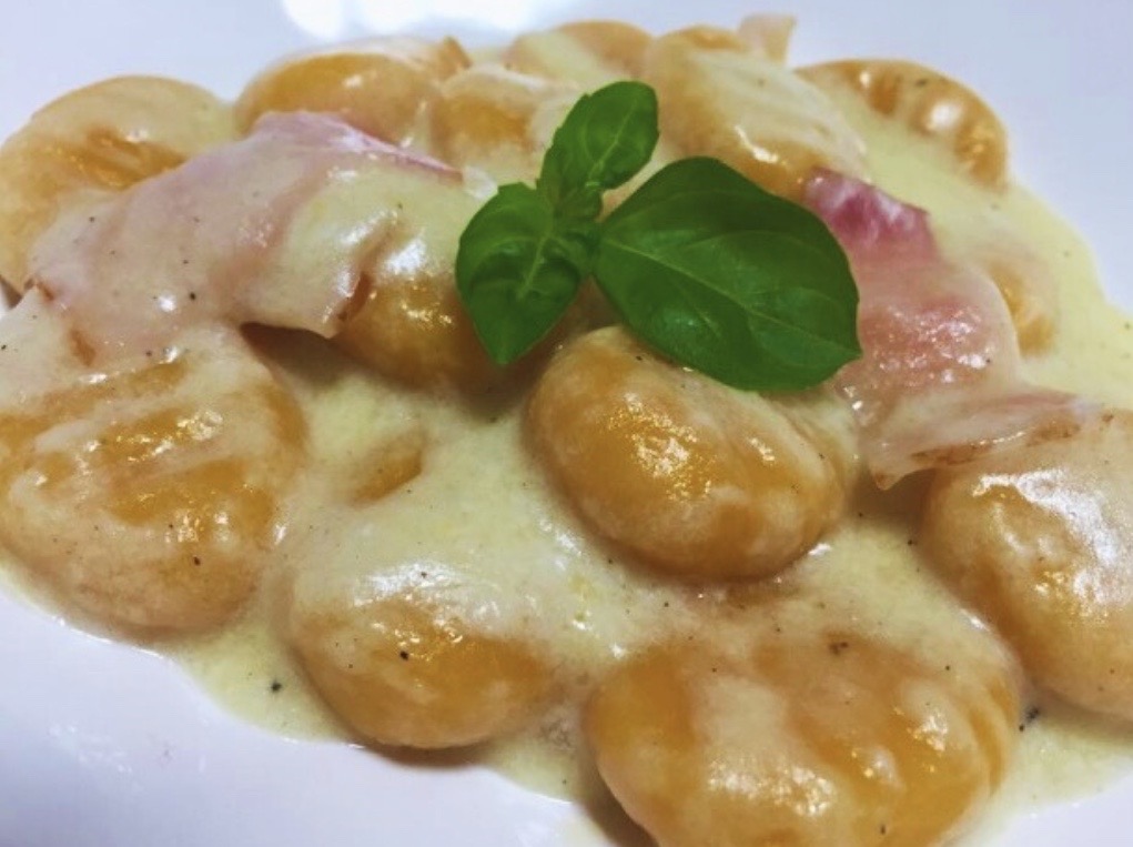 フライパンで玉ねぎとベーコンを炒め、バター・生クリーム・牛乳・コンソメを加え、とろみがつくまで煮る。