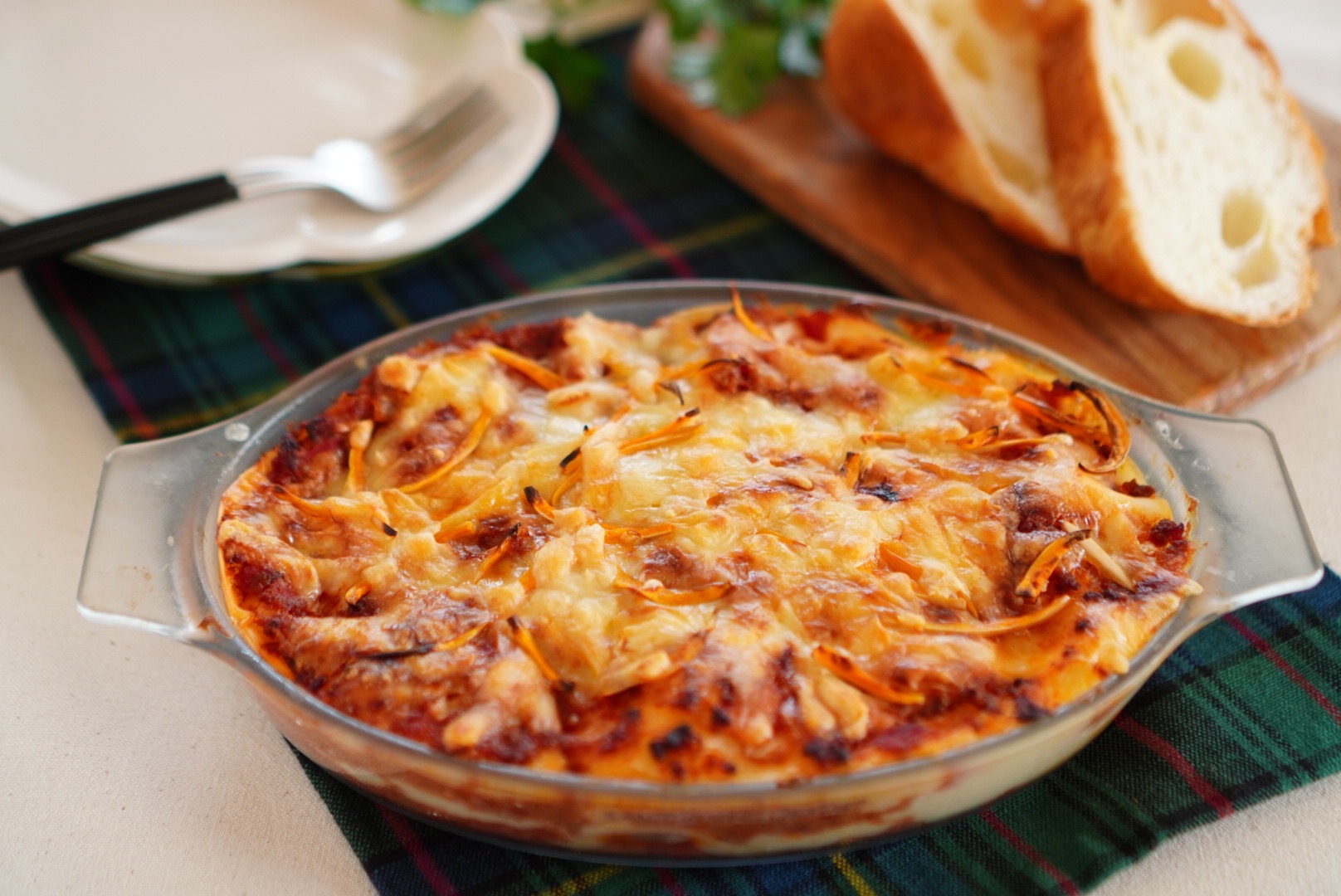 チーズとパン粉をふり、トースター(または200℃のオーブン)で7〜10分、こんがり焼く。